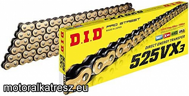 A DID 525VX lánc az 525V továbbfejlesztett változata, ami már X gyűrűs, megnövelt szakítószilárdságú és 100LE-ig ajánlott. E feletti teljesítményű motorokra célszerű az 525ZVM-X láncot feltenni, mert habár drágább, a gyakori magasabb terhelés extrém nyúláshoz vezethet. Esetenként egy motorhoz hozzá lehet rendelve gyengébb teljesítményű lánc is, mely olcsóbb, de célszerűbb hosszútávon az erősebbet választani. | A D.I.D egy prémium minőségi meghajtólánc gyártó cég, aki még mindig Japánban gyártja termékeit. Ez a garancia a folyamatos és megbízható magas minőségi szintre. A lánchoz nittelőszem jár. Gyártó: | DID | Típus: | 525 | Hossz: | 118 | Ajánlott teljesítmény / ccm: | 100LE | Szín: | arany | Gyűrű típusa: | X gyűrűs | Felhasználási terület: | utcai | Megvásárolom: | | |