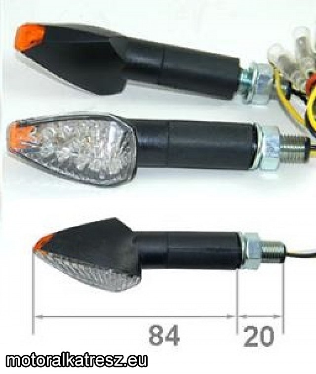 E jelzéses fekete háromszög alakú hosszú szárú univerzális index pár fehér burával, LED-es izzókkal. | Teljes hossz: 10,4cm Csavar hossza: 20mm Gyártó: | MotoPRO | Megvásárolom: | | |