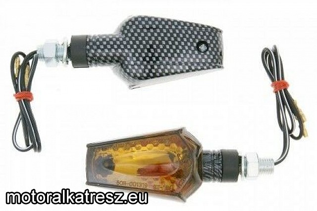 E jelzéses karbon/carbon szögletes rövid szárú univerzális index pár. | Hagyományos H21W izzó, az izzót az index tartalmazza! Teljes hossz: 100mm Csavar hossza: 20mm Csavar menete: M8 Gyártó: | Vicma | Megvásárolom: | | |